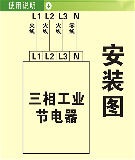 火线对火线,零线对零线,正面接线盒从左到右1.2.3线为火线,4线为零线。安装完毕后,指示灯亮,三相电子节电器开始工作,节电器要长期使用,保证最好的节电效果。(一年包退包换,3年免费维修)